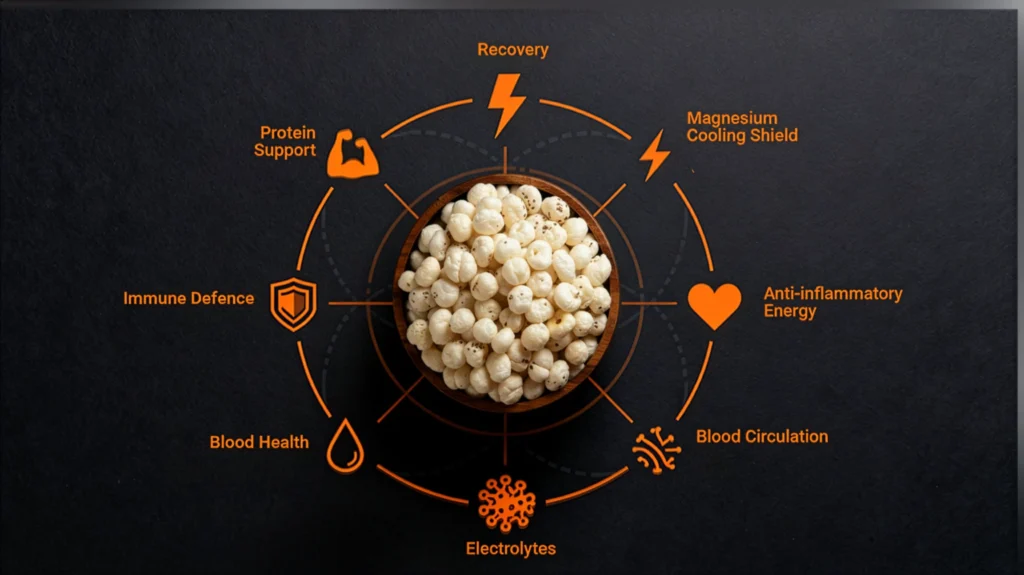- Electrolyte and Athletic Performance – Research shows that adequate potassium and magnesium reduce cramping, enhance contraction force, and accelerate recovery. Makhana’s mineral density exceeds most conventional pre-workout options.